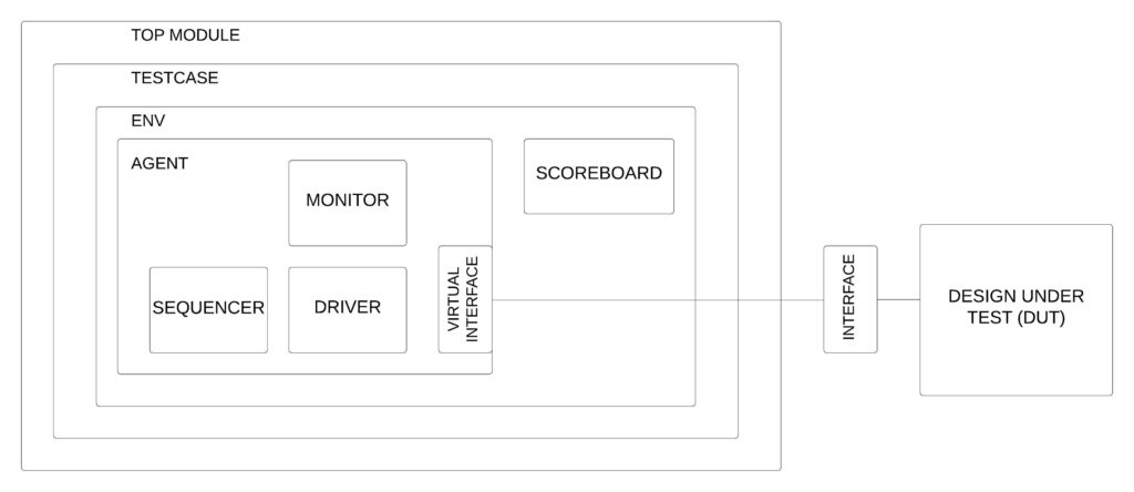 The diagram below represents how our testbench should look. NOTE that the connections are not shown; it’s a rough diagram of our Testbench.